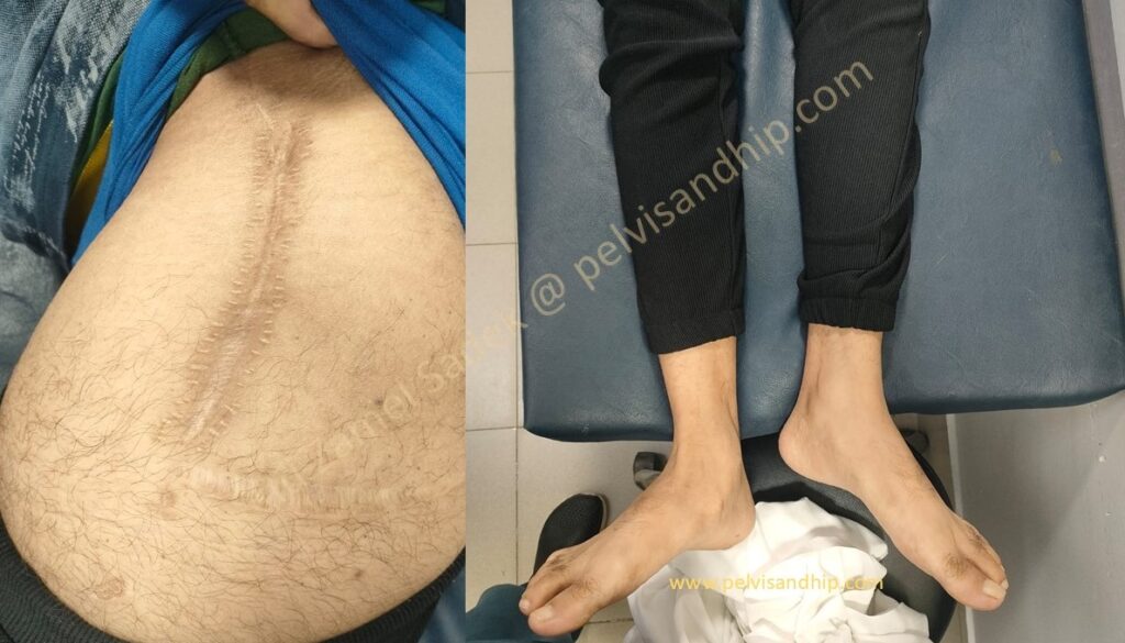 The obvious leg length discrepancy on the left side. The scar of previous interventions suggest some lateral based surgical approach which is well healed with no obvious suspicion of active inflammation.