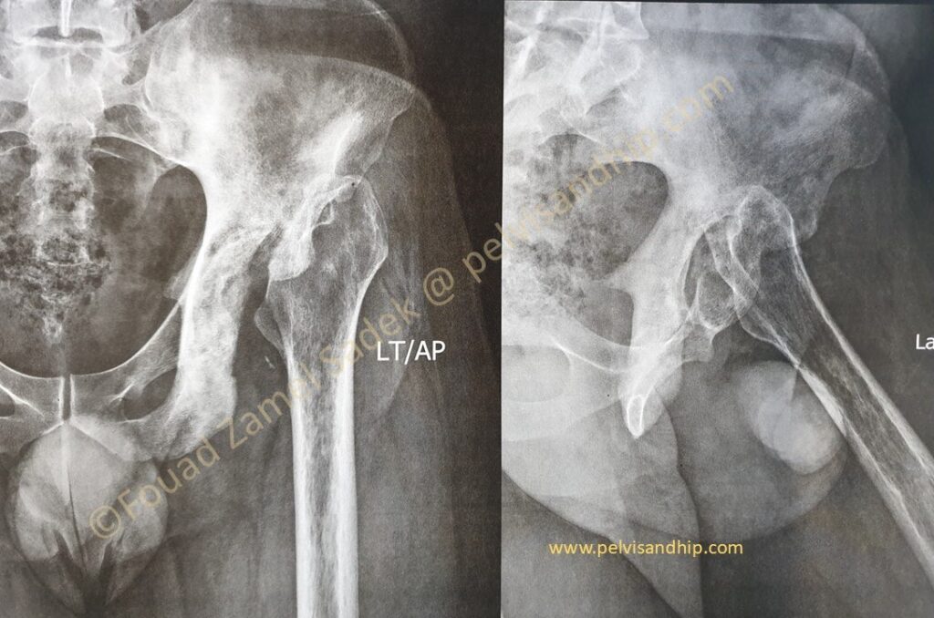 A 34 years old male with a two years history of previous infections related to the left hip and pelvis. Previous surgical interventions to clear infection carried out more than a year ago with no obvious recurrence of infective related issues. Note that he also has arthritic changes on the right hip as well.