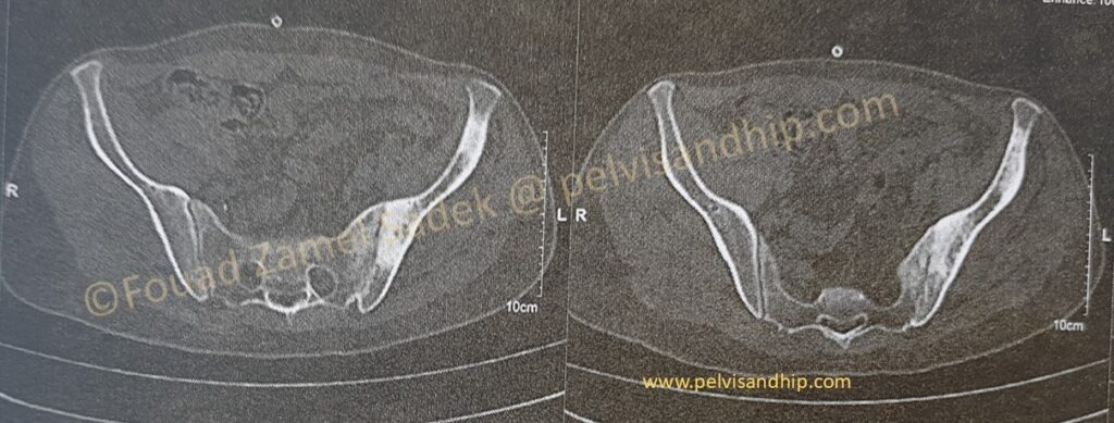 Axial CT cuts reveal a more extensive involvement of the hemipelvis with obvious skeletal changes in response to previous infection including a bony ankylosis of the left SI joint with some extension of the bone reaction in the ilium.