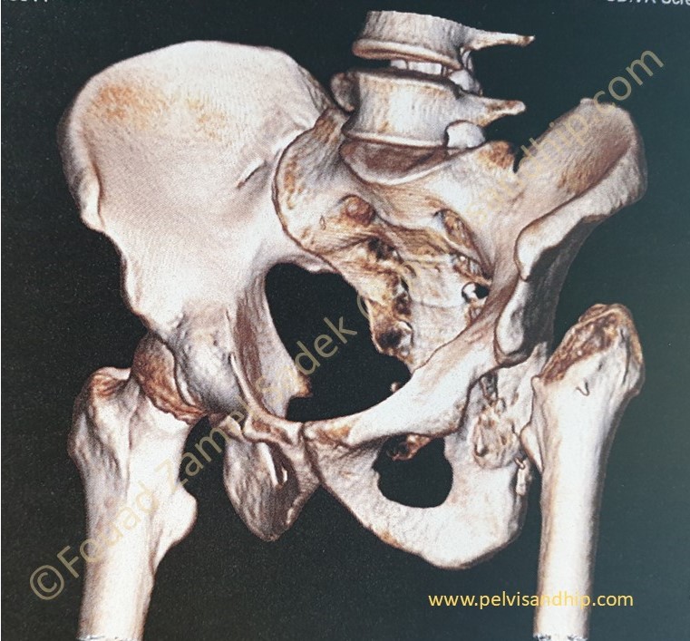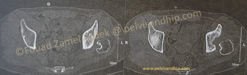 The posterior view of the 3D reconstruction confirms again the posterior wall deficiency by comparison to the contralateral right hip posterior wall.