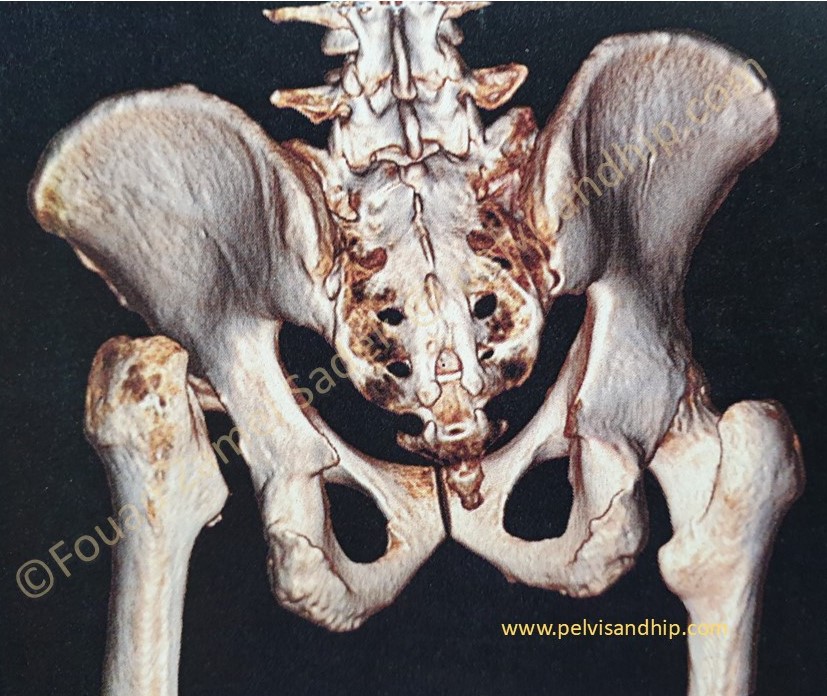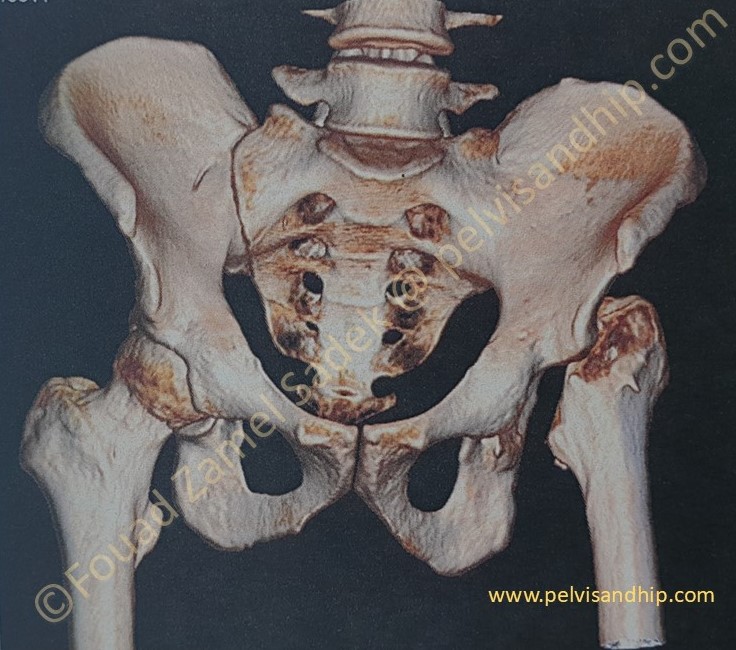 The oblique view of the this 3D reconstruction again confirms the left SI joint ankylosis. It also brings in profile the superior dome which shows its deficiency.