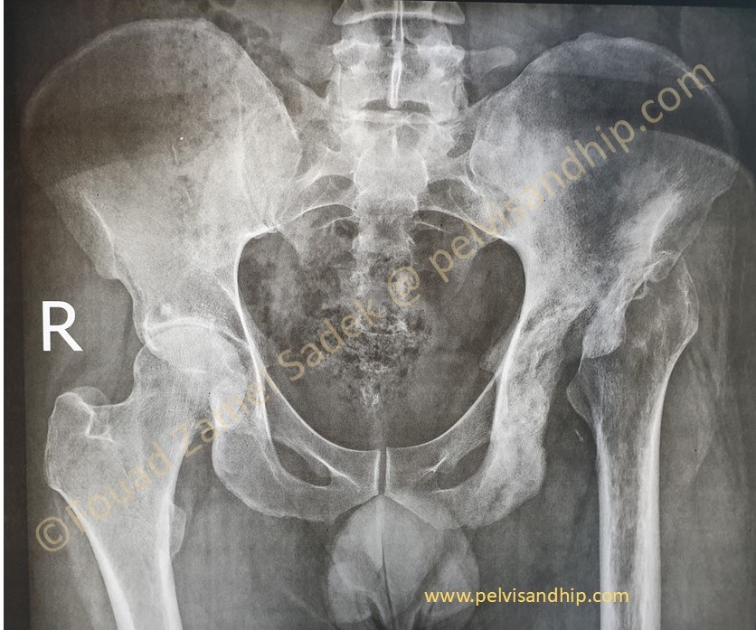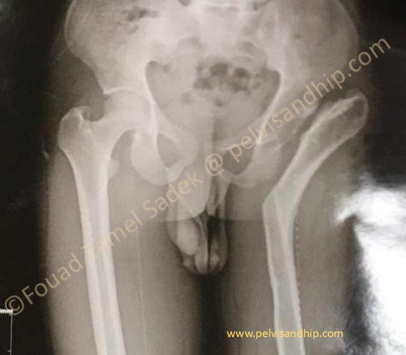 Case 5: 30 years old war victim who presented one year after a neglected transverse with posterior wall fracture of the right acetabulum. Associated posterior hip dislocation; by contrast to the usual central dislocation of most transverse fractures. (please click on the picture for further studies)